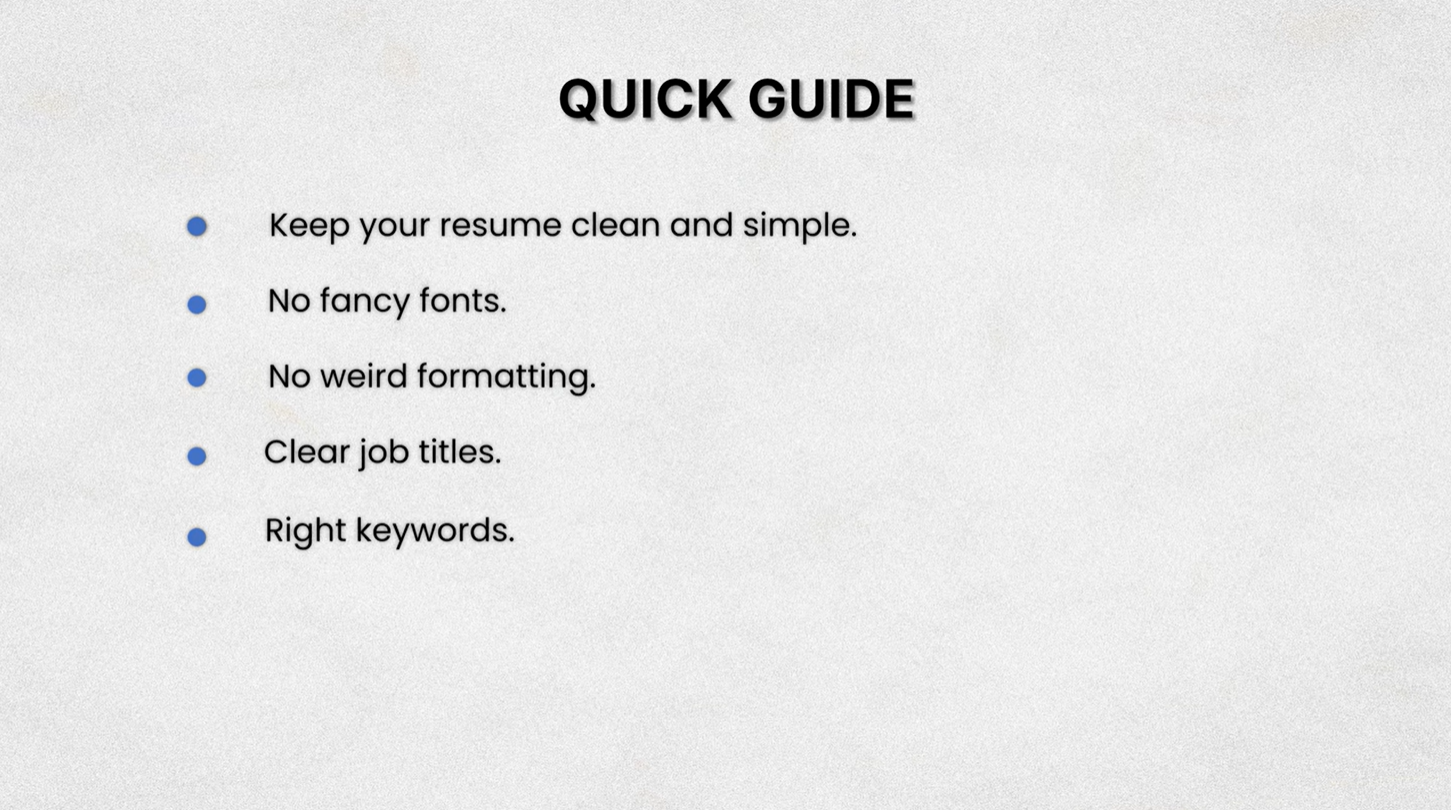 And here’s how to do that. Keep your resume clean and simple. No fancy fonts. No weird formatting. Just clear job titles, bullet points, and the right keywords from the job listing.