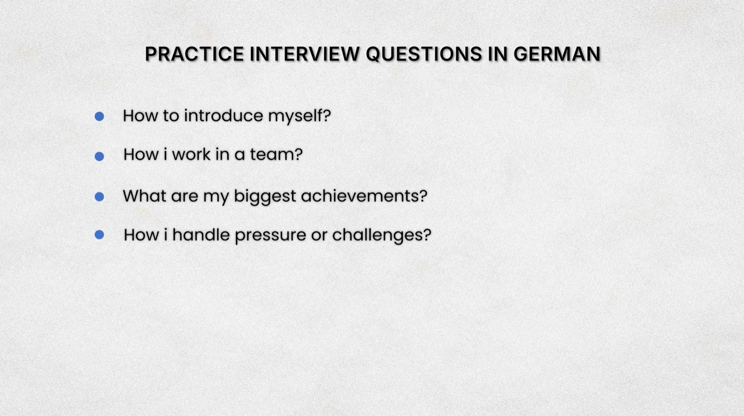 Another thing that really helped me was practicing common interview questions ahead of time. In German. Things like how to introduce myself, how I work in a team, what my biggest achievements are, and how I handle pressure or challenges—stuff like that. If you are interested, I’ve got a list of common interview questions both in English and German.