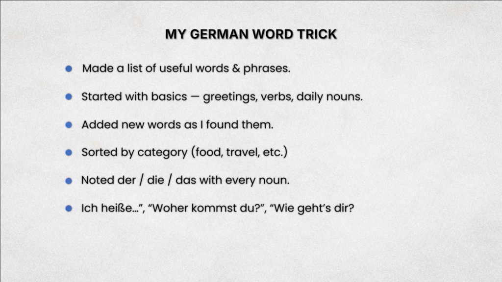 Anytime I came across a word or phrase that felt useful, I added it to my list. And to stay organized, I classified them into categories: food, travel, emotions, tech, and whatever made sense. And for every noun, I made sure to write down the article der, die, or das right next to it.