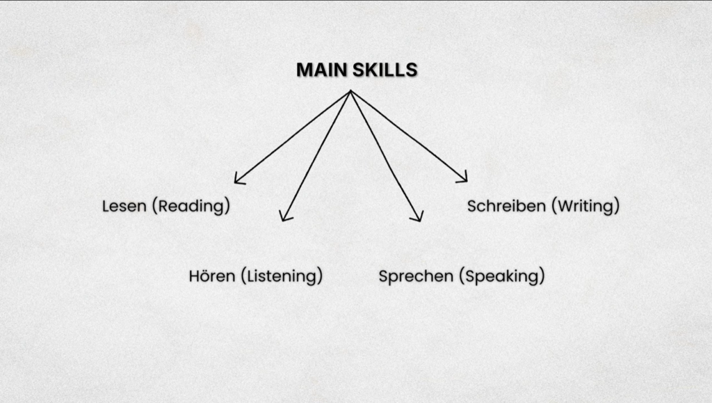 When it comes to learning German, you’re really working on four main skills: Lesen (Reading), Hören (Listening), Sprechen (Speaking), and Schreiben (Writing).